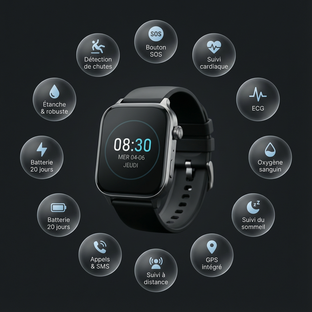 Elle surveille les signes essentiels, accompagne le quotidien et permet de demander de l’aide immédiatement en cas de besoin.